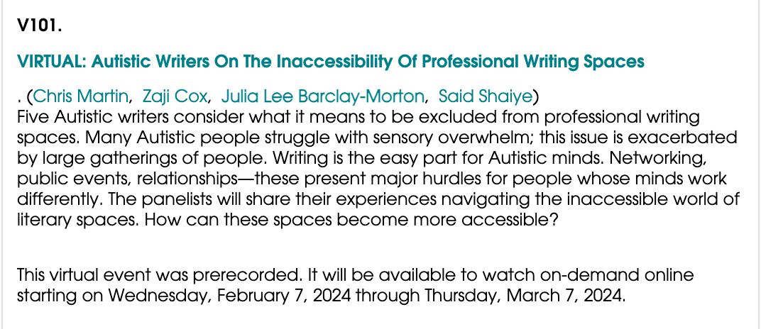 A screenshot of the event description for the virtual panel “Autistic Writers on the Inaccessibility of Professional Writing Spaces,” presented at AWP 2024.
